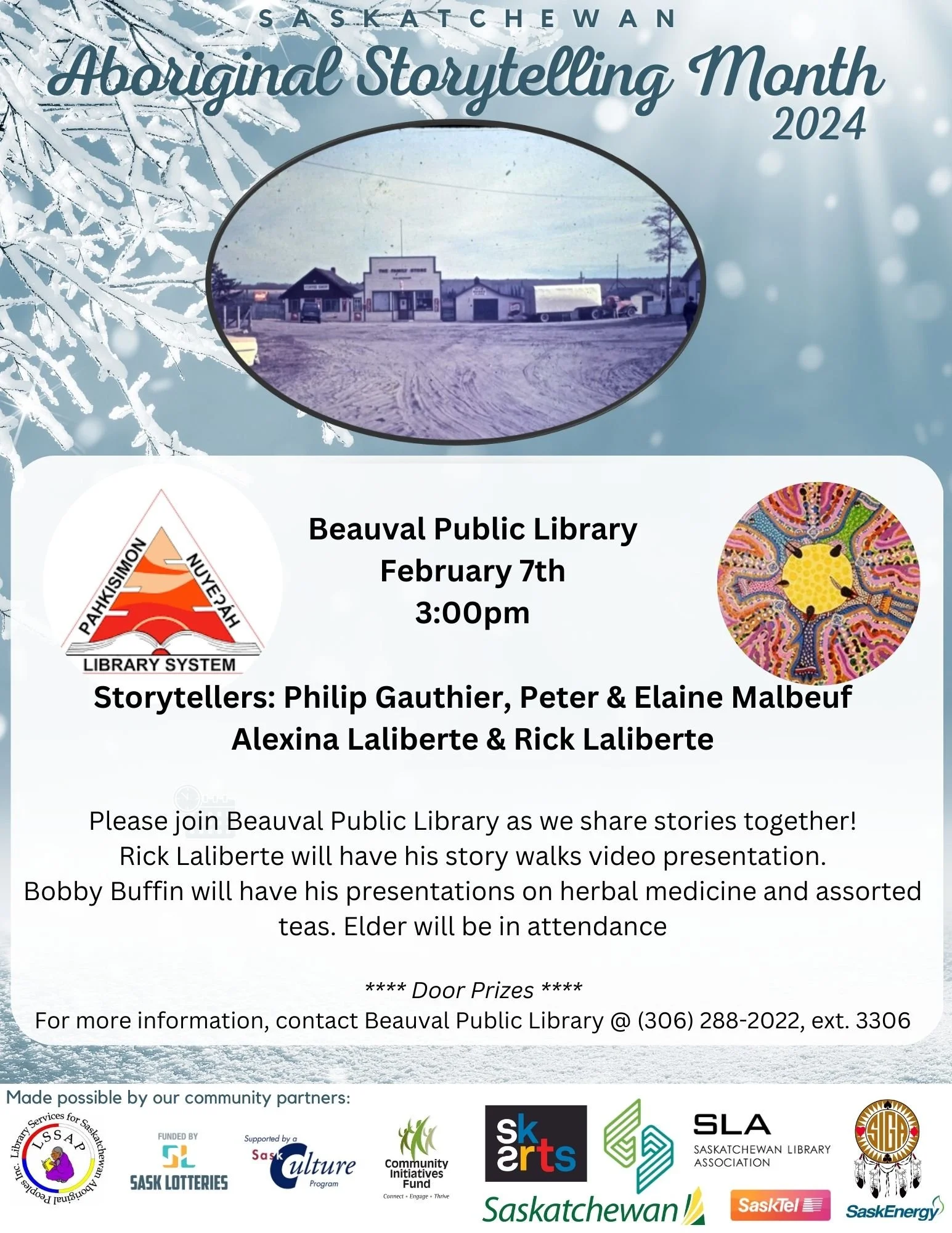 Join Beauval Public Library as they share stories together. Rick Laliberte will share his story walks video presentation. Bobby Buffin will have his presentation on herbal medicine and assorted teas. Elders will be in attendance. Attendees will have the chance to win door prizes.