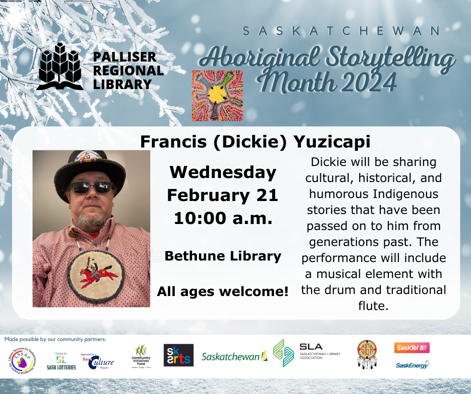 Bethune Library will be hosting a Storytelling session with Francis (Dickie) Yuzicapi. Dicki will be sharing cultural, historical, and humorous Indigenous stories that have been passed on to him from generations past. The performance will include performance of drum and traditional flute by Dickie, who is a talented musician as well as a storyteller, and entrepreneur.