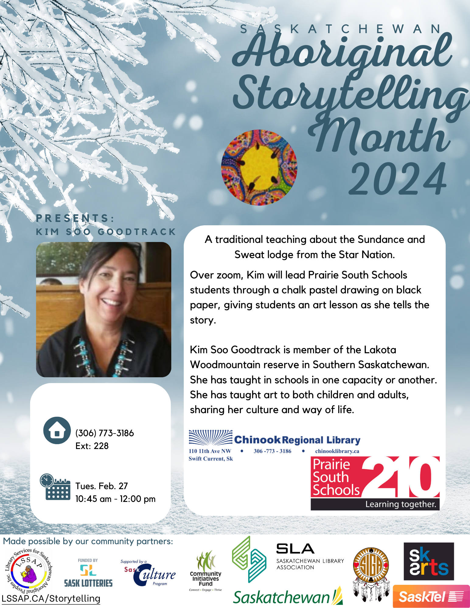 Chinook Regional Library and Chinook School Division are cooperating to host a virtual storytelling session with Kim Soo Goodtrack. Kim will lead students through an art lesson and story.
