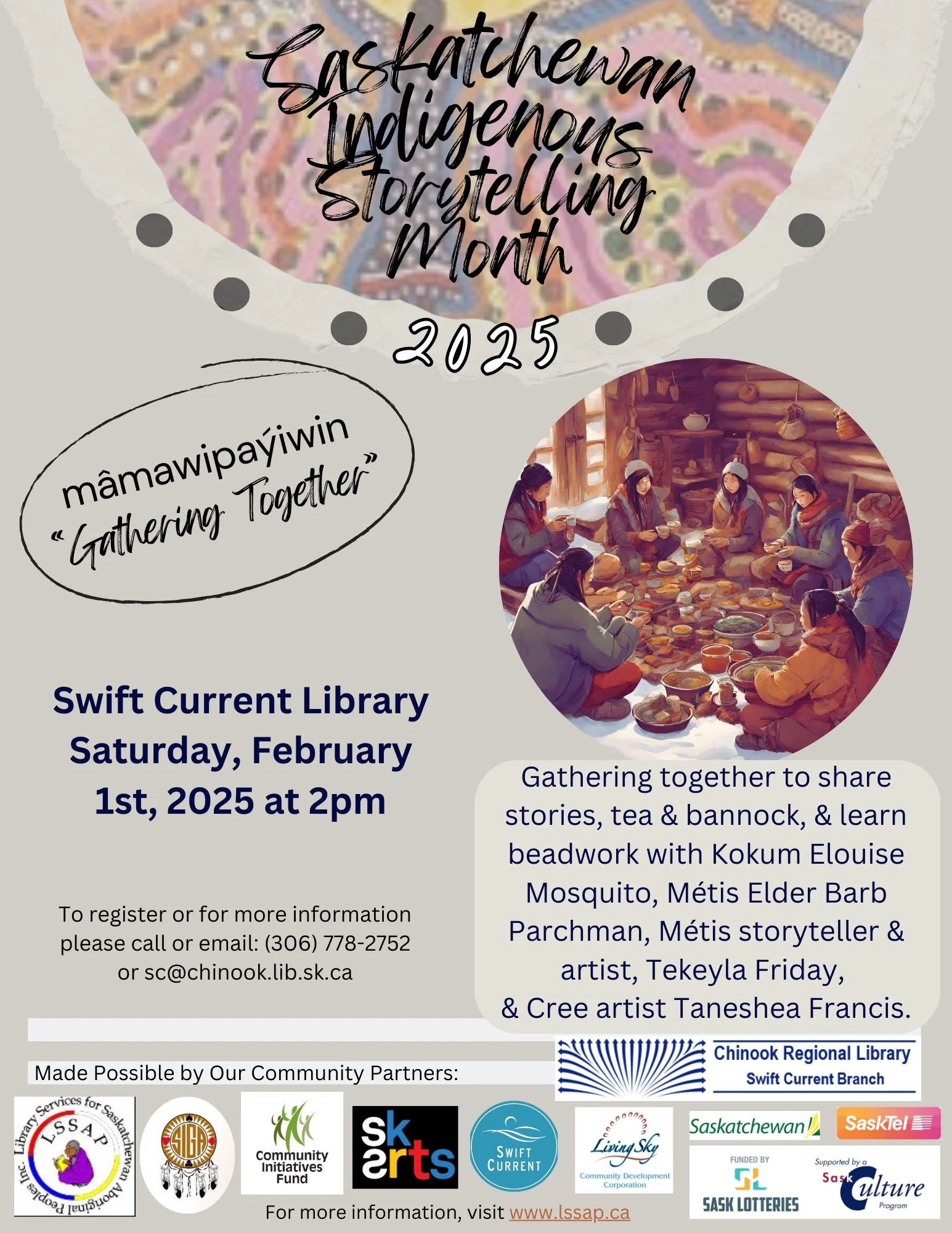 Gather at the Kincaid Library to share stories, enjoy tea and bannock, and learn to make bead-work with Kokum Elouise Mosquito, Métis Elder Barb Parchman, Métis storyteller & artist Tekeyla Friday, and Cree artist Taneshea Francis.