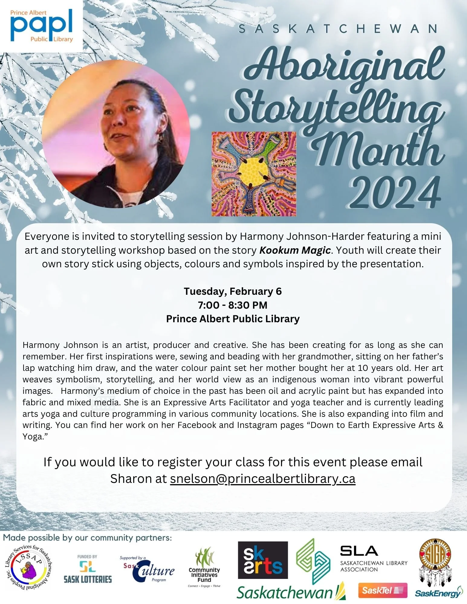 Everyone is invited to Prince Albert Public Library for a storytelling session with Harmony Johnson-Harder based on the story Kookum Magic. Youth attending will get to create their own story stick using objects, colours, and symbols inspired by the presentation.
